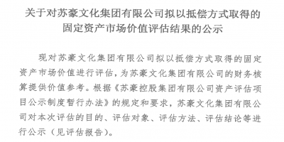 關(guān)于對(duì)蘇豪文化集團(tuán)有限公司擬以抵償方式取得的固定資產(chǎn)市場(chǎng)價(jià)值評(píng)估結(jié)果的公示